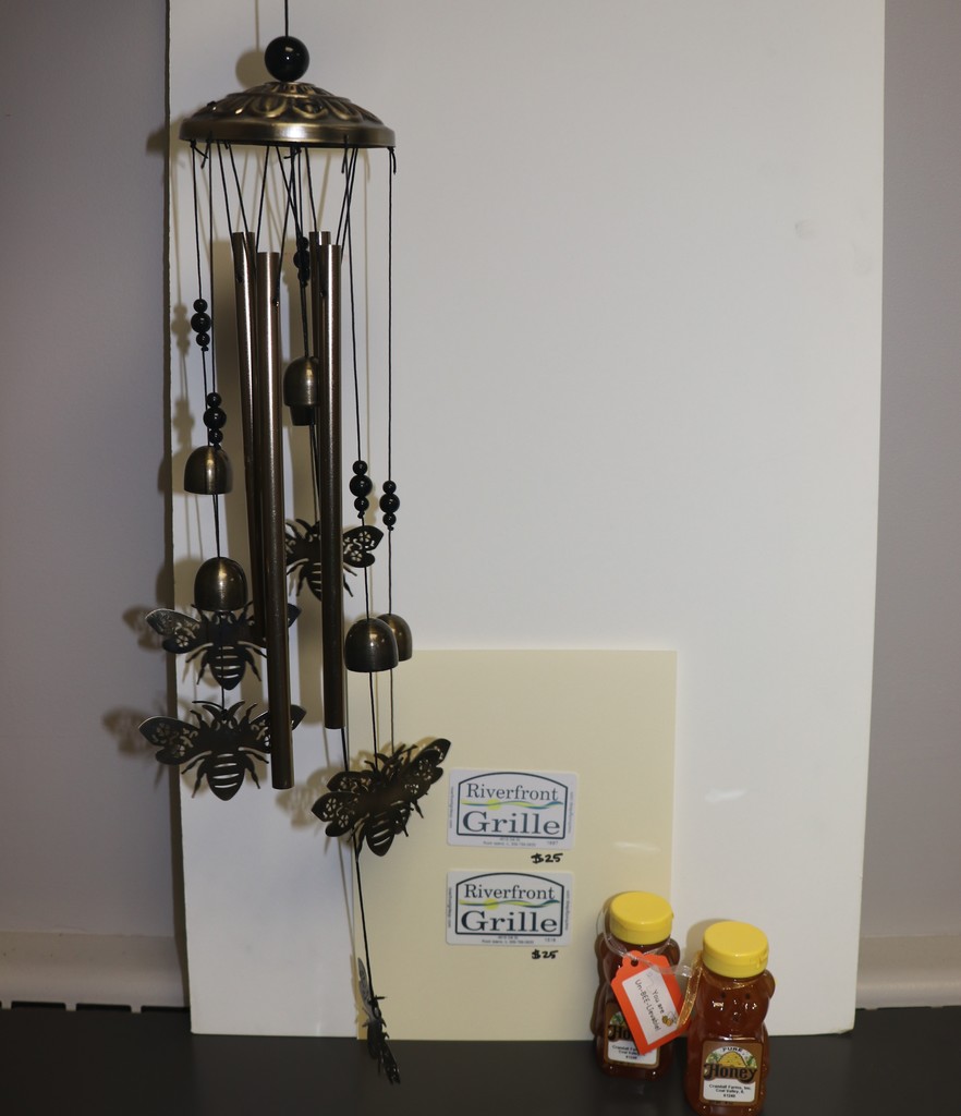 (2) $25 Riverfront Grille Gift Cards, Two bottles of honey, and Bee Themed Wind Chime