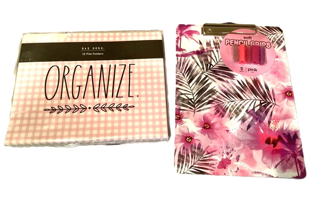 Set of 12 gingham heavy duty file folders. Four blue SAVE folders; four gray FILE folders and four pink ORGANIZE folders. Includes a tropical pattern 13 x 9 inch clip board and a set of 5 pencil grips.