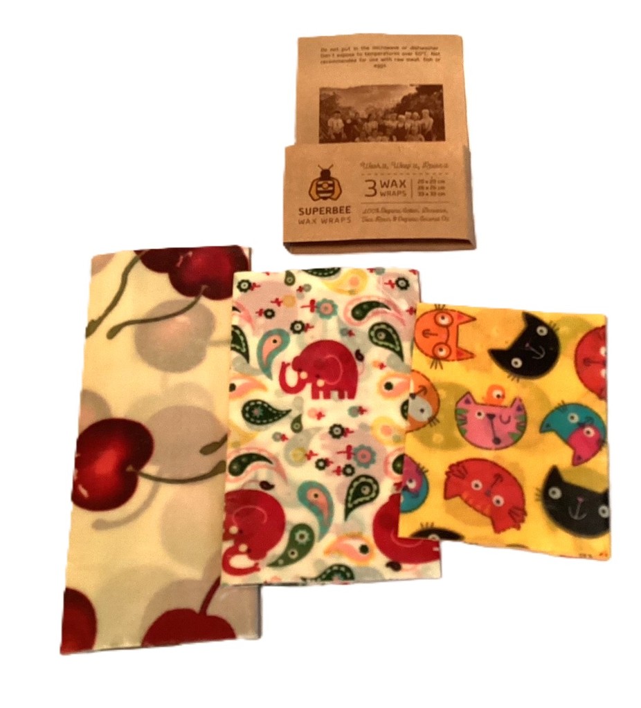 A natural alternative to plastic wrap. Made with care using beeswax, organic cotton, organic plant oil and tree resin. Features cherry print size 12 x 12 inch; elephant print 10 x 10 inch; cat print 8 x 8 inch.