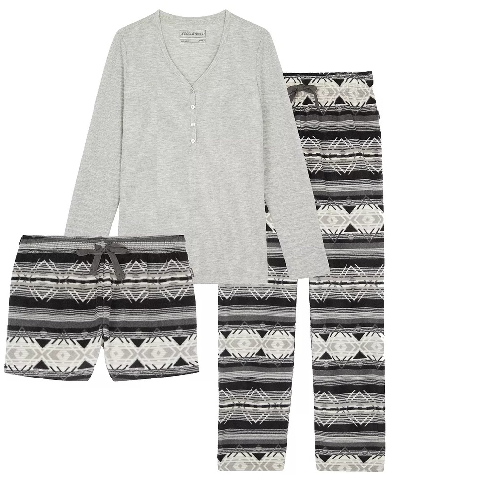 This cozy 3-piece sleep set from Eddie Bauer is a must have for the comfort-loving lady. Features a waffle weave top with Henley neckline and 4 button front; a pair of fleece shorts with 3.25 inch inseam; a pair of fleece pants with 31 inch inseam. Pants and shorts both have functional drawstring waistbands. Top measures 22 inches under arms. 63 percent polyester/35 percent modal; 2 percent spandex. Light gray top and pants are black/white/gray print. Great versatile fall to winter set!