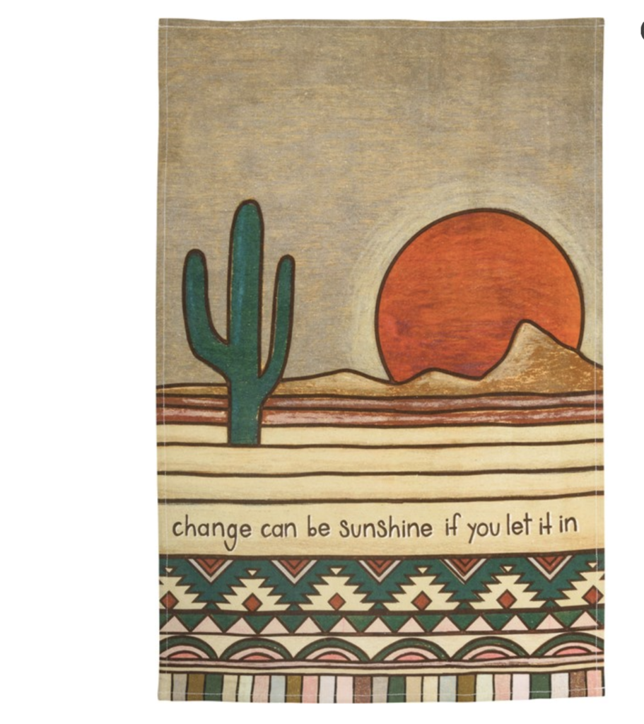 A cotton kitchen towel featuring "Change Can Be Sunshine If You Let It In." sentiment and muted woodburned desert designs. Includes cotton tape loop for easy hanging. Towel comes rolled and wrapped with cotton tape and includes hangtag displaying full design. Machine-washable.
