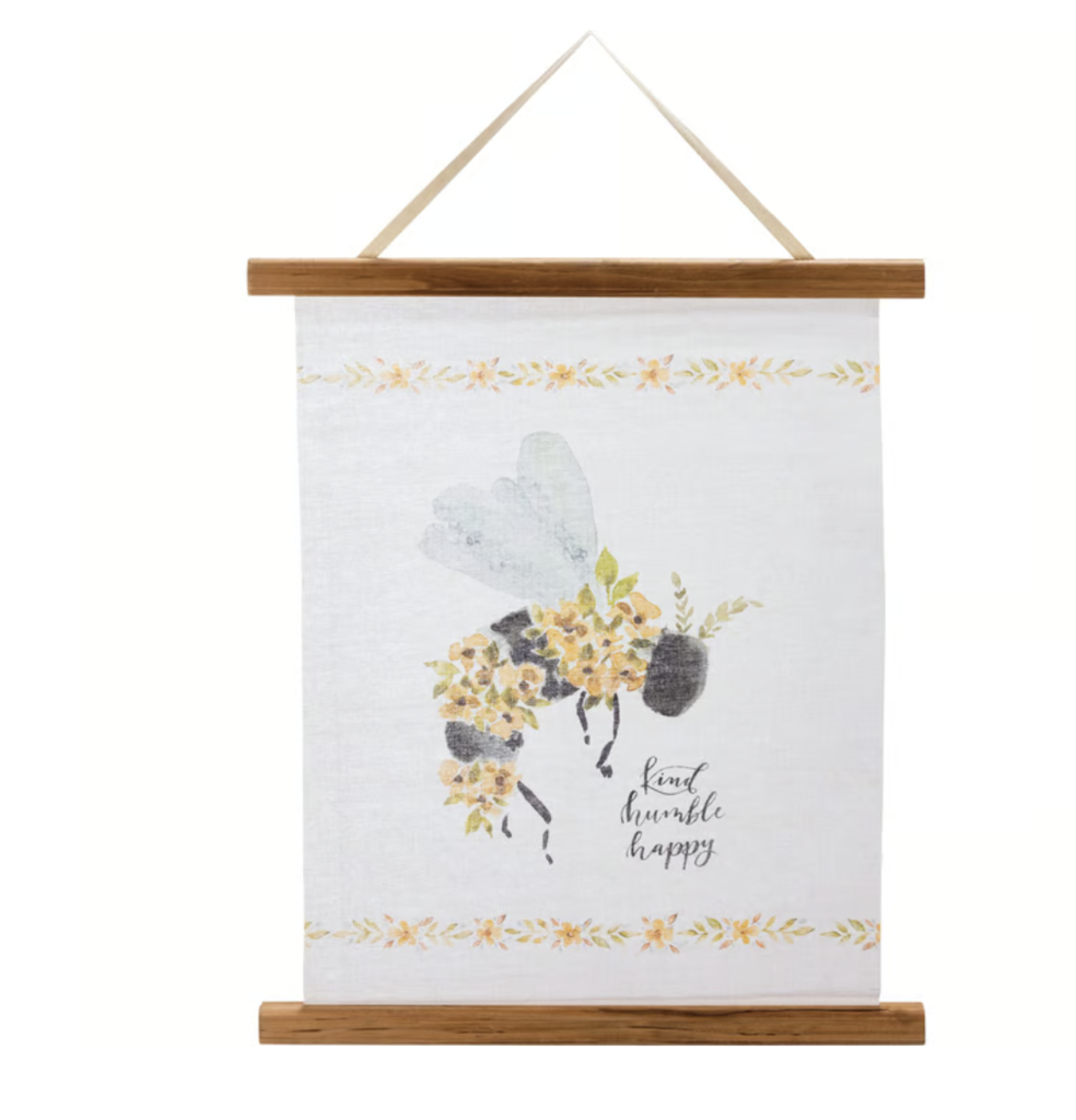 A hanging wall decor piece featuring a watercolor floral bee design with hand lettered "Kind Humble Happy" sentiment.