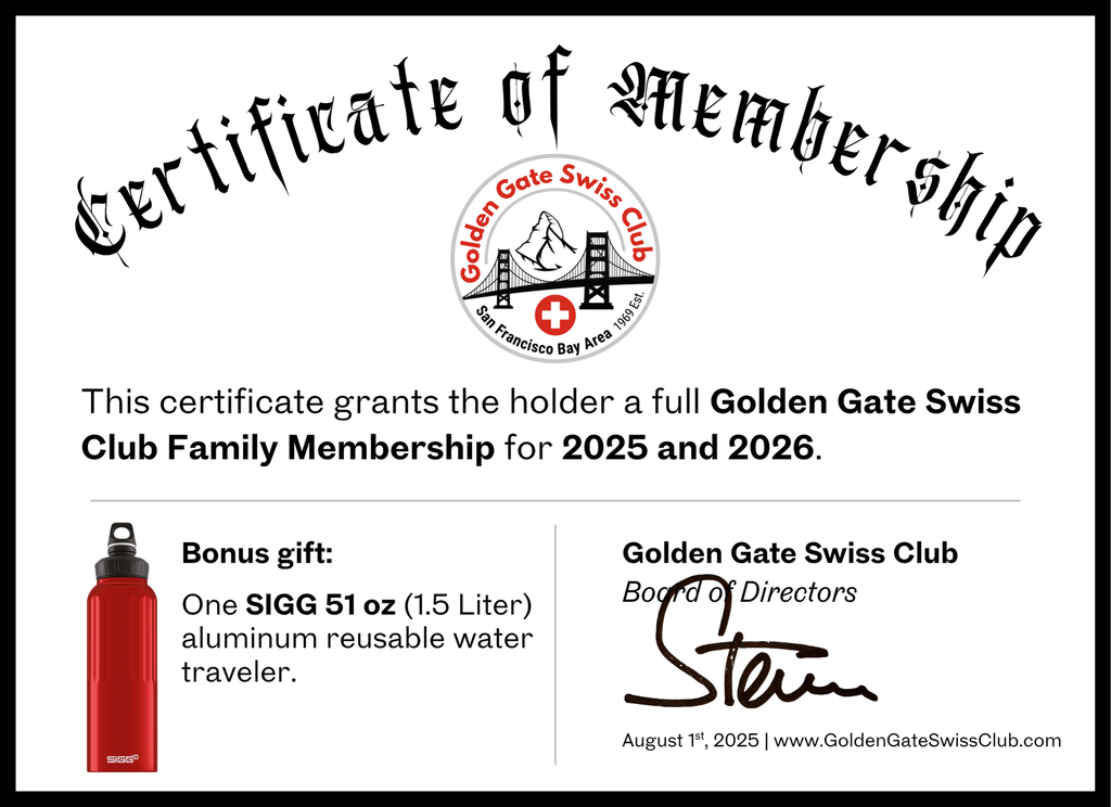 Full 2025 and 2026 Family Membership to Golden Gate Swiss Club. Includes a Bonus Gift: One SIGG 51 oz (1.5 Liter) aluminum reusable water traveler.