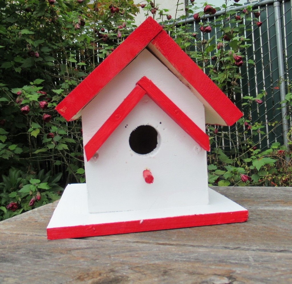 This is a charming white bird house with barn red roof. The rustic barn design, combined with the bold color scheme, makes it an eye-catching addition to any garden or outdoor space. Perfect for bird lovers or as a decorative accent.