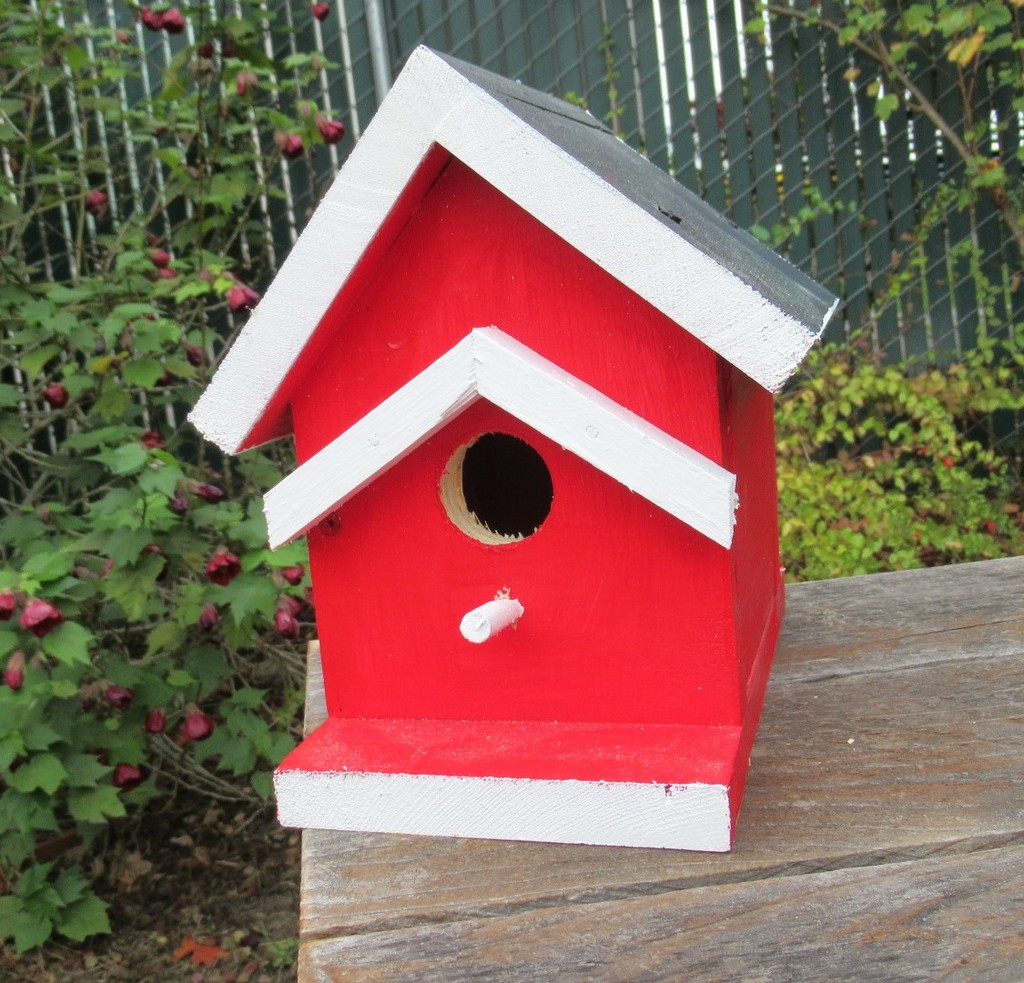 Locally handmade red birdhouse that is beautifully crafted with a striking contrast of white trim and a black roof. Its charming design adds a rustic touch to any garden or outdoor space, making it an ideal home for local birds or a decorative piece for bird enthusiasts.