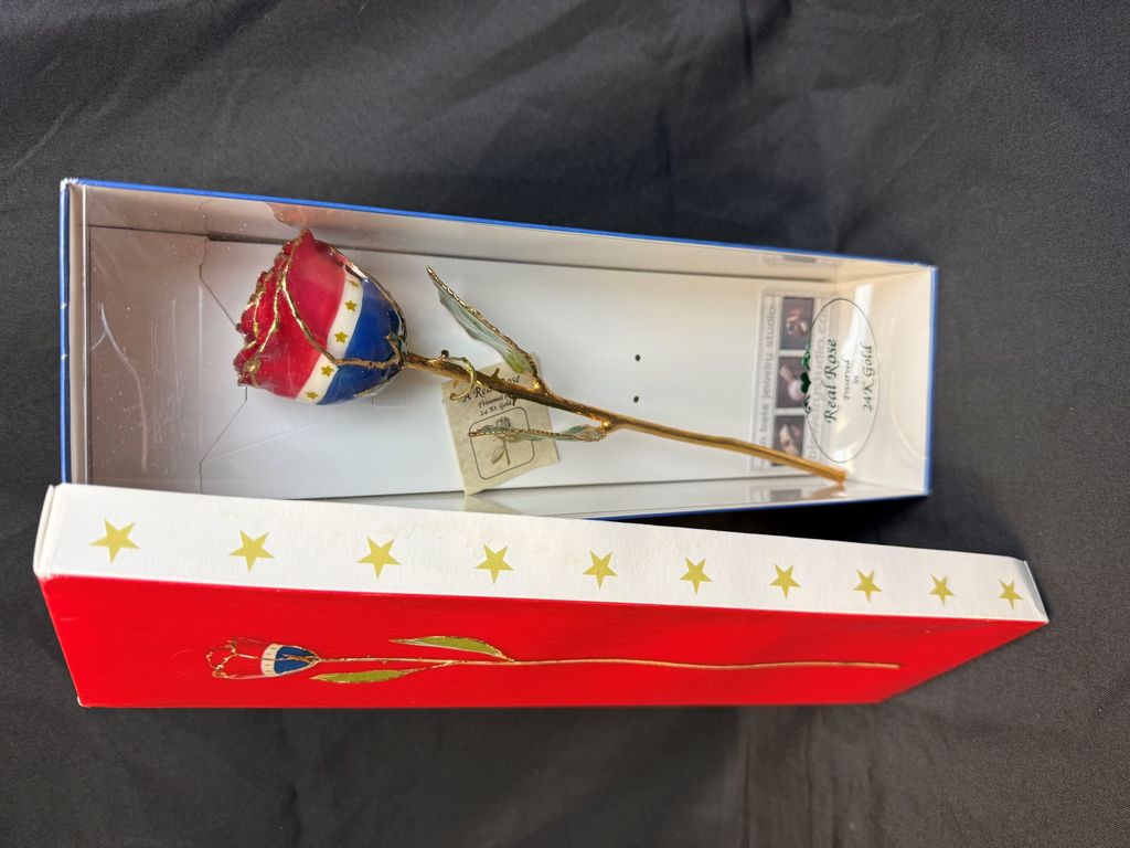 This patriotic Liberty Rose contains a real rose which is hand picked and preserved in 24K gold. Each rose is carefully selected, sized and preserved at the peak of its beauty. A fine, delicate layer of lacquer is then applied to preserve its natural appearance, hand-painted, electroformed and trimmed with 24k gold finish.