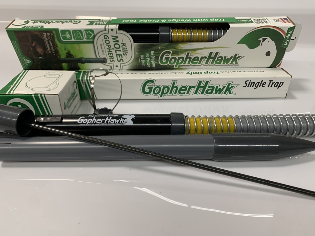 Manufactured in the USA, GopherHawk is enjoyed by golf course superintendents to efficiently and humanely kill gophers and moles. GopherHawk's unique design solves many of the challenges associated with traditional trapping. GopherHawk is set from above ground with no mess, no baiting, no digging and no poison. Also, the above ground catcher indicator is visible when the trap is activated.