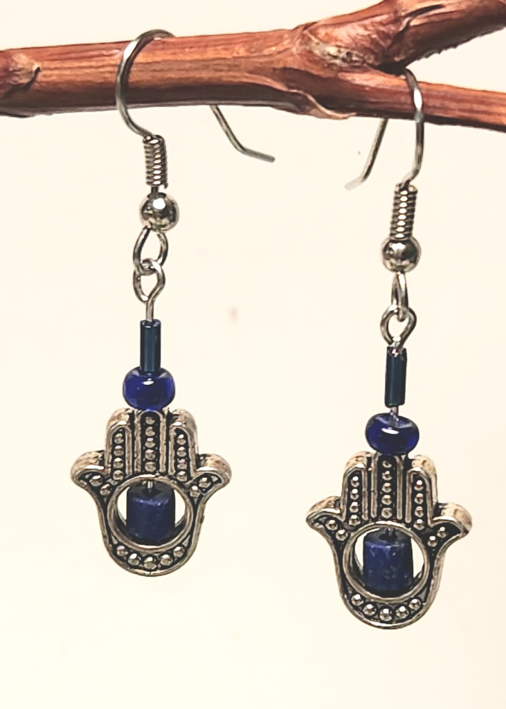 The Hand, or Hamsa, is a sign of protection that also represents blessings, power, and strength. The lapis lazuli beads in the center of the hands represent wisdom, truth, inner-power, self-expression, and are said to ward off evil.