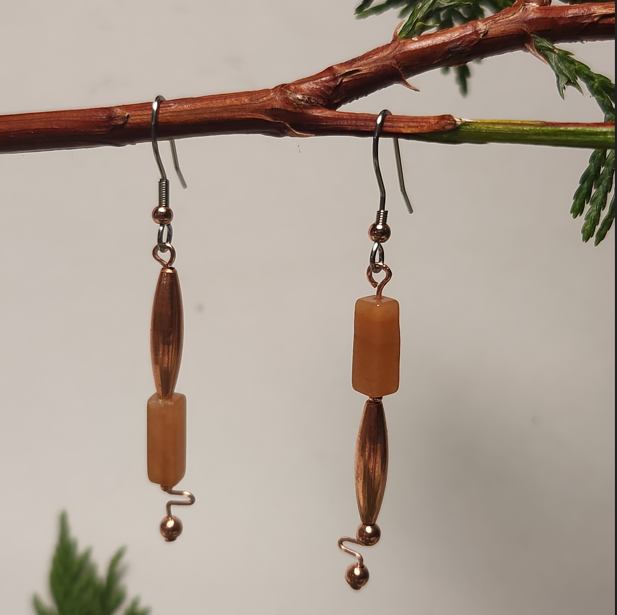 Wow, these earrings are cool! They are named "Two Thin" by the artist due to their long, narrow quality. The adventurine and copper beads of different colors, sheen and texture complement one another perfectly. Note the two copper beads at the bottom of the earrings separated by a sweet piece of metal in a sideways u-shape. There is also a small copper bead at the top of each earring. These drop earrings measure 2" from the surgical steel earwires.