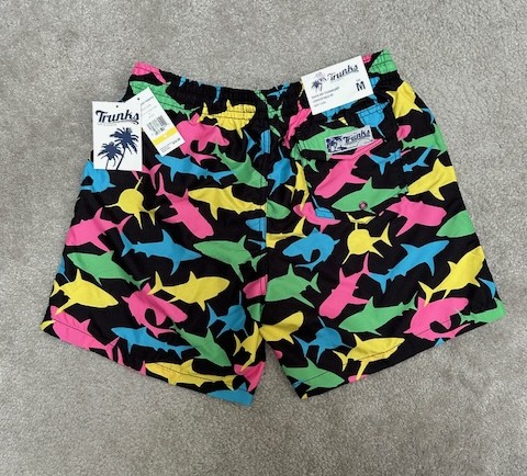 This item is BLACK (with multicolored Sharks) - in Size "ADULT MEDIUM". It's a NEW "Trunks Surf and Swim Company" brand Bathing Suit / Swim Trunks. Quick-dry technology, mesh lining, rear pocket with adhesive velcro to keep closed. Available for nationwide bidding. Item can be shipped to Winning Bidder or picked up for FREE in Enfield, CT after the Auction. Fun style, great fit!