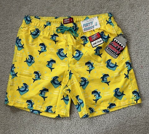 This item is YELLOW, Size "ADULT LARGE". It's a NEW "Party Sharks" brand Bathing Suit / Swim Trunks. Quick-dry technology, mesh lining, rear pocket with adhesive velcro to keep closed. Available for nationwide bidding. Item can be shipped to Winning Bidder or picked up for FREE in Enfield, CT after the Auction. Fun style, great fit!