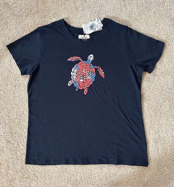 New with tags. High quality, excellent fit! Beautiful Women's Cut "Stella Parker, Island Designs" - Navy Blue with a cute TURTLE (in Red, White, and Blue Sparkly Sequins). This shirt is WOMEN'S SIZE "SMALL". (Note: There are two additional similar Turtle Shirts in this Auction, too (in Size Large) - if you'd like to MATCH with friends and family.) Shirt is 60% Cotton, 40% Polyester. Item can be shipped nationwide to winning Bidder (with insurance) or picked up for FREE in Enfield, CT. Start your Holiday Shopping early....