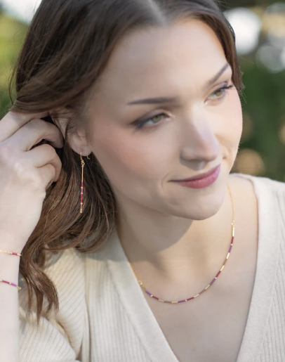 From Holly Yashi comes this fabulous pair of their Sierra Stick Earrings earrings and a matching Sierra Menda Necklace. Hand crafted with heart in Arcata, California, these dangle earrings have a 1.5 inch drop with gold-plated ear wires and the necklace measures a versatile 18 inches.