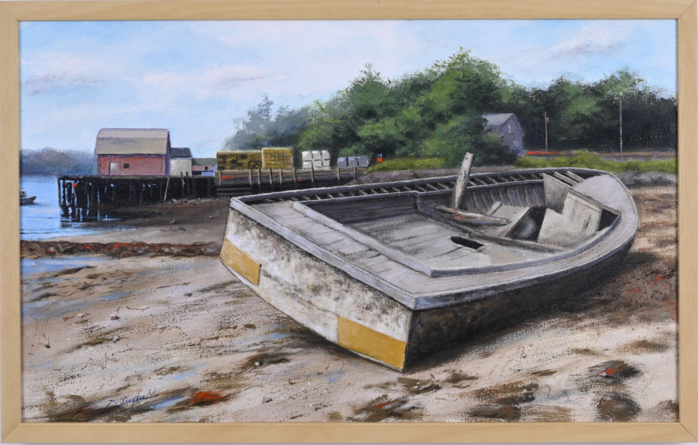 "Abandoned" was derived from the artist's visits to Bailey Island in Maine. Campbell discovered the sea worn abandoned boat resting on the shore line of Mackerel Cove. Later as he worked on the canvas in his studio, he wondered what kind of exciting stories of the sea this now weather-worn skeleton of a ship could tell.