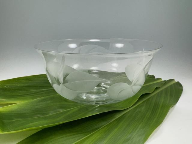 This item is a gorgeous glass bowl with images of lovely anthuriums finely etched along the exterior. It measures 10" in diameter and 5" high. This beautiful piece evokes the tropical flora of Hawaii with the etched anthurium motif. Study the images and see how the anthuriums can transform from a milky glass color to the hue of the surface it sits upon. The bowl could be used as a lovely decorative item or the sturdy glass also makes this a perfect candidate for a prized piece used for everyday dining in your home.