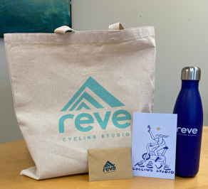 1 class at Reve Cycling Studio, Reve-branded Swell Waterbottle, and Reve-branded Tote