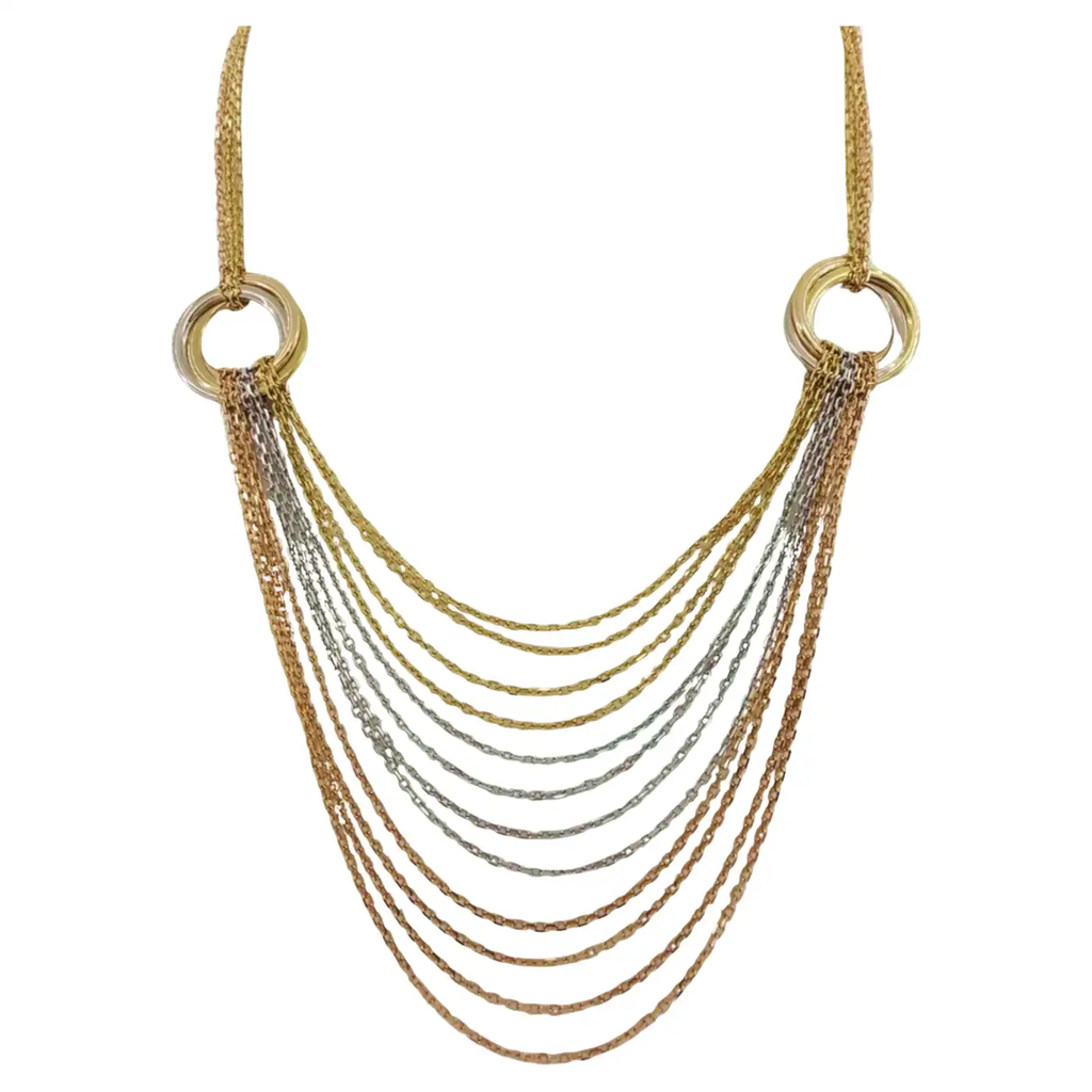 Treat yourself or someone you love with this breathtaking vintage necklace from Joan Boyce, Ltd., featuring a stunning piece from Cartier's renowned Trinity Collection. This exquisite necklace showcases a luxurious blend of 18k yellow, white, and rose gold, creating a radiant display that captures light beautifully. Cascading gracefully, the design resembles a precious waterfall, weighing an impressive 34.6 grams of gold that adds both elegance and value. Ideal for collectors and fashion enthusiasts alike, this necklace is a timeless statement piece that enhances any ensemble. Don?t miss the opportunity to own this extraordinary piece of jewelry history! Appraisal Certificate included.