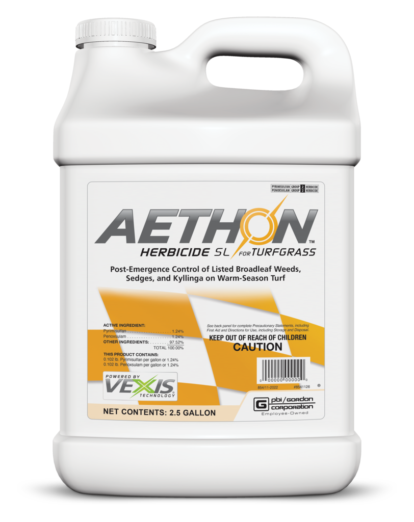 AethonŽ Herbicide SL for Turfgrass delivers broad-spectrum control of listed broadleaf weeds, sedge and kyllingas. It?s labeled for use on established warm-season grasses and is a liquid formulation that saves time and labor by controlling listed weeds with one product and one application.