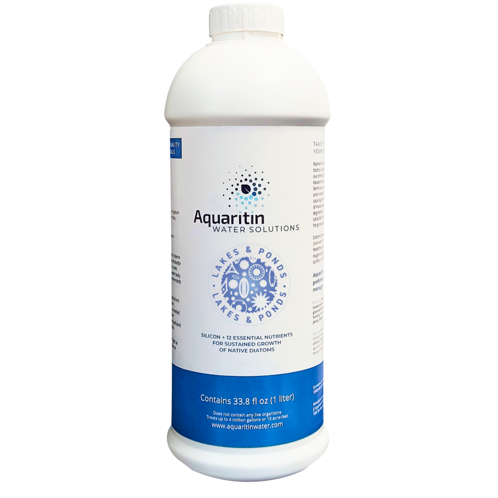 Aquaritin Lakes & Ponds uses breakthrough nanotechnology to deliver micronized silicon and 12 essential nutrients in a single formulation for exclusive growth of native diatoms.