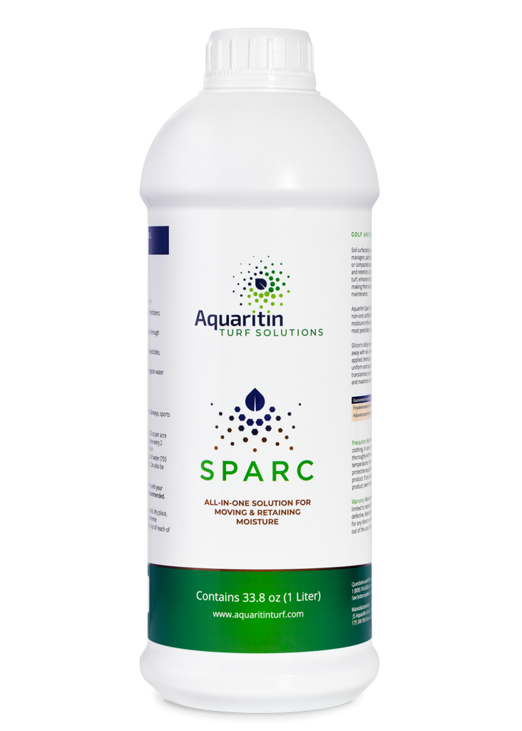 Aquaritin Sparc is the last wetting agent you will ever use! With our proprietary nano-scale technology, you can expect firm playing surfaces, tour-quality smoothness & trueness, less LDS, less irrigation, low use rate - 6.7oz/ac. - 13.5oz/ac. and affordable for course-wide use.