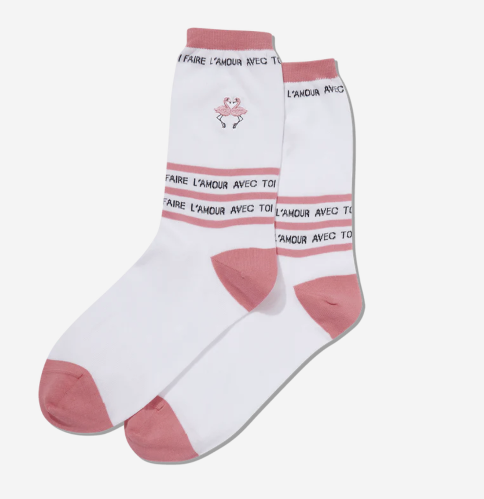 Made to flamingle. These charming crew socks showcase flamingo embroidery, colorful trim and romantic lettering.
