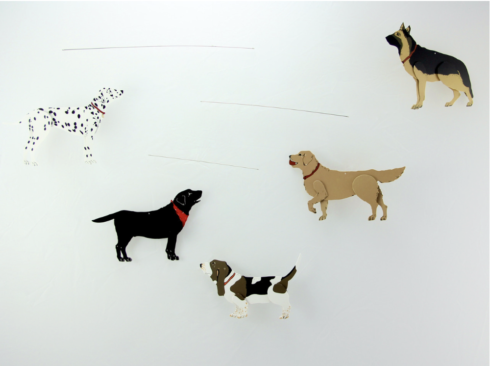For the dog lover, this mobile features a golden retriever, dalmation, German shepherd, labrador retriever, and a basset hound. Made of stainless-steel rod and intricately designed, printed, and die-cut dogs on heavy artboard. Hangs approximately 20" tall by 30" wide. Includes 5 types of dogs, ranging in size up to 8" long. Includes educational fact sheet on dogs. Comes fully assembled.
