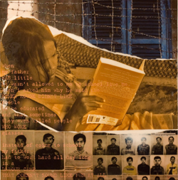 Mixed media artwork by Sabina Malik. In excellent condition. Submitted in 2008 to the Amnesty intermational (Vancouver) art auction that marked the 60th anniversary of the Universal Declaration of Human Rights, representing Article 26 (the right to education). 30" x 30".