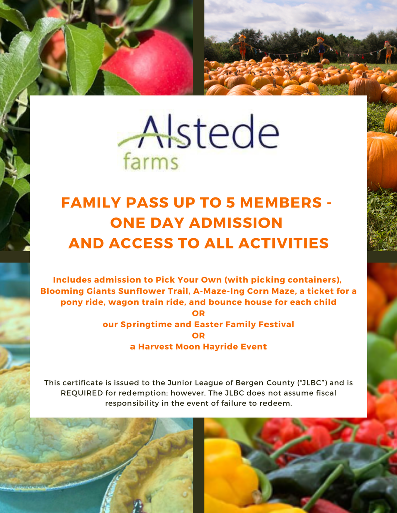 One-Day Family Admission (up to 5 members). Visit Alstede Farms for Pick Your Own, Blooming Giants Sunflower Trail, A-Maze-Ing Corn Maze, Springtime and Easter Family Festival OR Harvest Moon Hayride events.
