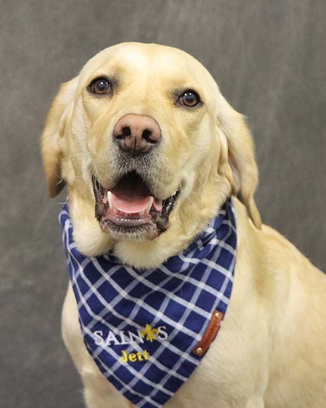 Before arriving at NSA, the half golden retriever half labrador retriever spent nearly two years receiving specialized training from Mutts With A Mission, which trains service dogs for disabled veterans, first responders and law enforcement at no cost to the recipient. When not at work, Jett enjoys taking long walks, watching squirrels and taking a nice nap on the couch.