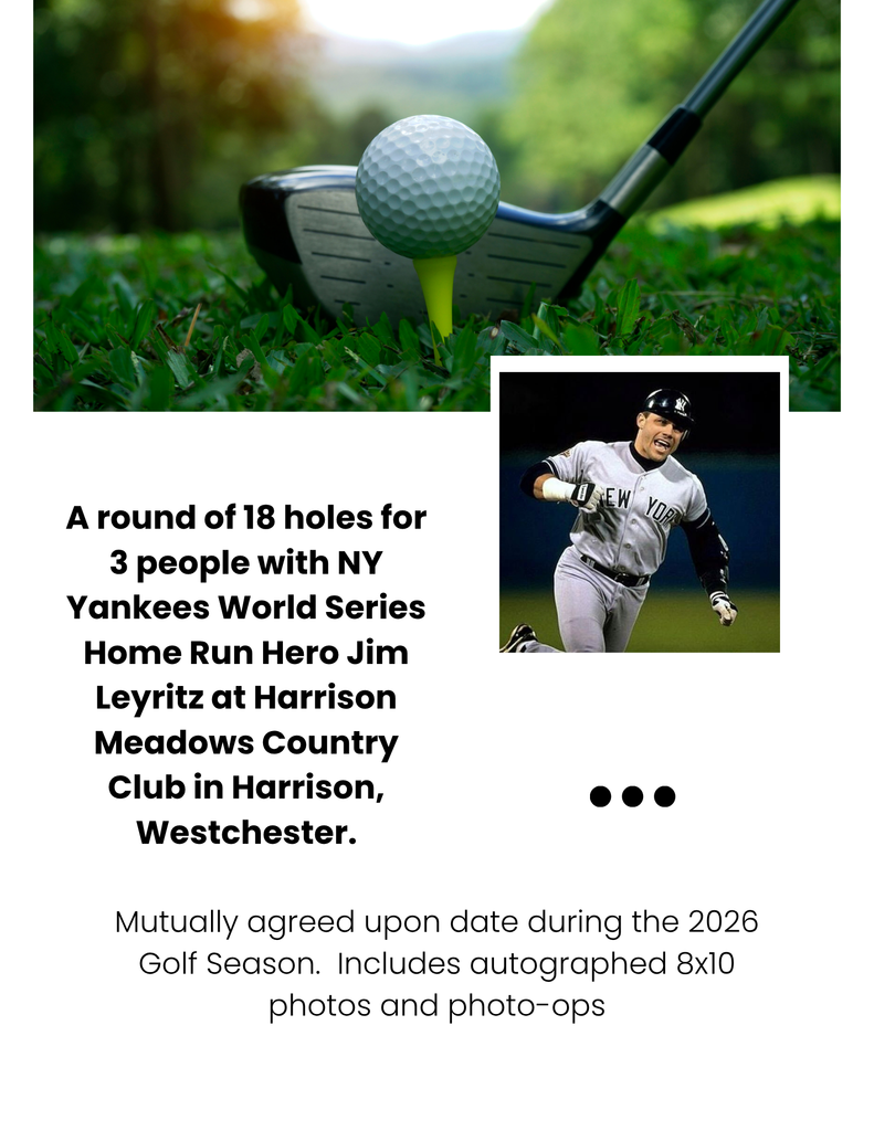 Golf for 3ppl w/ NY Yankees World Series Home Run Hero Jim Leyritz at Harrison Meadows CC in Westchester. Includes Golf Carts, Lunch, autographed WS Home Run photos and Photo Ops