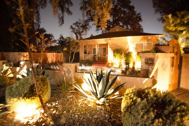 This property has been featured on the Garden Tour by the Garden Club twice: one year for the lushly planted backyard and outdoor living space and another year for the unique use of hardscape and drought-tolerant plants to create the beautiful front yard landscape. The backyard features a hot tub, built-in fire pit, large waterfall and Koi pond with beautiful professionally done landscaping. The backyard is patio surrounded by landscaping, rather than a grassy lawn. The covered patio area has a functional outdoor kitchen and an outdoor dining table which seats 6. The remainder of the patio is covered with 2 large umbrellas, so that nearly the entire backyard is shaded. The large, hot tub has room for 6 adults. Follow the path through the front yard past the boulders, dry creek bed, and desert-scape landscape design. There is another patio space here as you make your way up to the covered porch, that leads to the front door. Elegant landscape lighting adds ambiance to the front and the back landscaping and living spaces.
