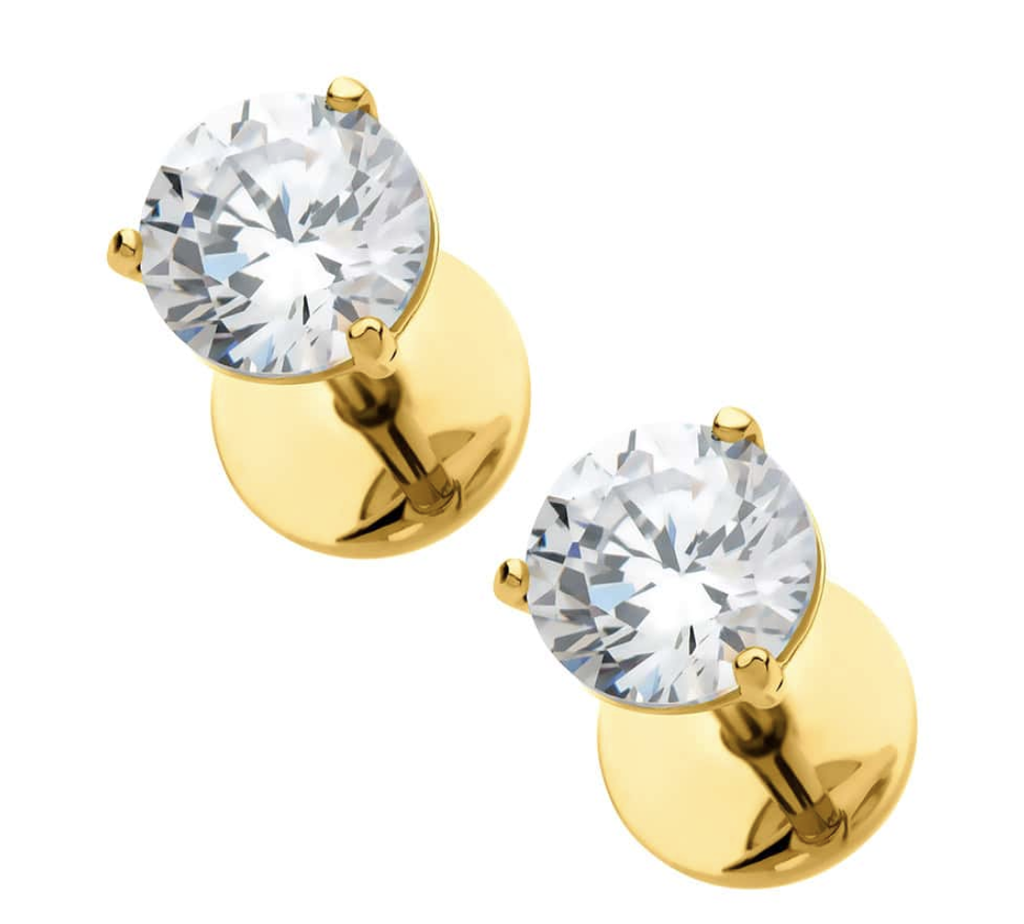 Be comfortable and stylish in ComfyEarrings. Featuring high-quality round 5.0 mm cubic zirconia stones set in 24K Gold Plated 316L Surgical Grade Stainless Steel. Posts are standard width, 18 gauge or 1.0 mm. (Length of post is 6.0 mm long, which is "one size fits most.")