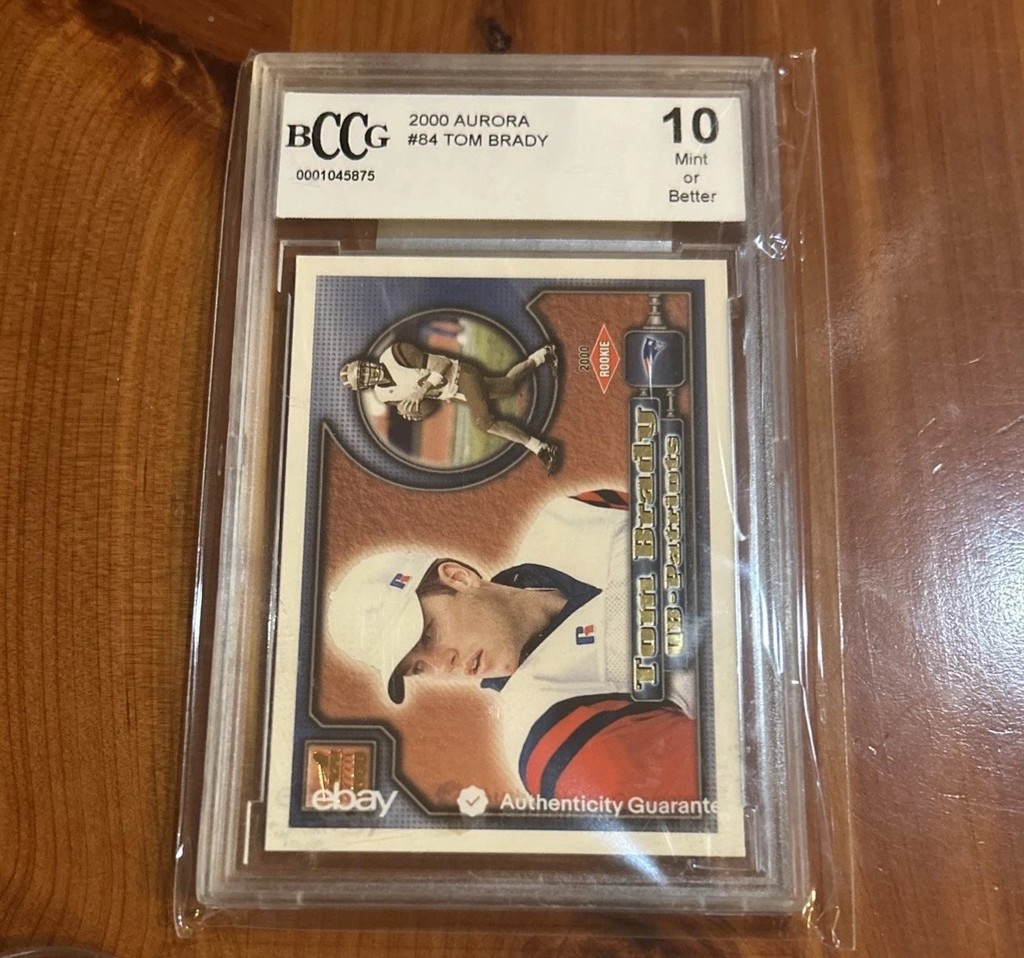 Up for auction is a highly sought-after 2000 Pacific Aurora Tom Brady #84 Rookie Card, professionally graded BCCG 10. This pristine gem-mint card captures the early career of one of football?s greatest quarterbacks, making it a must-have for serious collectors and sports memorabilia enthusiasts. A rare opportunity to own a flawless piece of NFL history with exceptional investment potential.