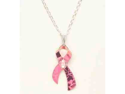 A one inch pink ribbon with a small pink crystal glass stone in the center hangs on an adjustable 18-20 inch silver chain, with HY stamped clasp. The ribbon is made from Niobium and the chain is silver overlay all creating a bright look with a message of hope and commemoration.