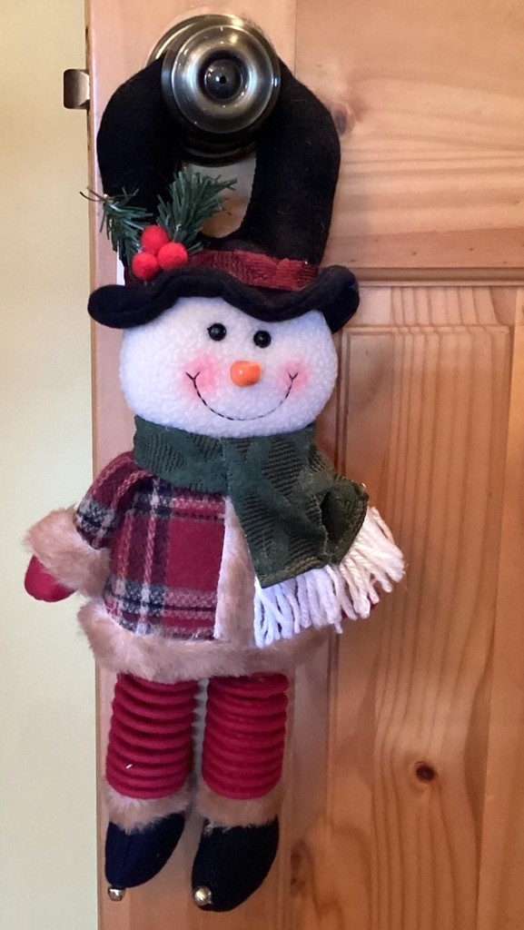 This stuffed Snowman Door Hanger will add a cheerful touch of color to your door. Measures 16 inches long with springy legs and bells on his shoes