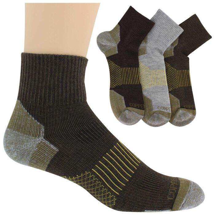 Boost your comfort and performance with these men's Copper Fit Quarter Crew Work Socks. Crafted with arch Strong Compression and infused with copper for odor reduction, these socks offer superior support and freshness all day long. With cushioned, reinforced heel and toe areas, they provide extra durability for long-lasting wear. Plus, their moisture-wicking technology keeps your feet dry and comfortable, making them perfect for workouts, long days on your feet, or everyday wear. Elevate your sock game and experience the difference with Copper Fit Quarter Crew Work Socks! Fits shoe size 6-12