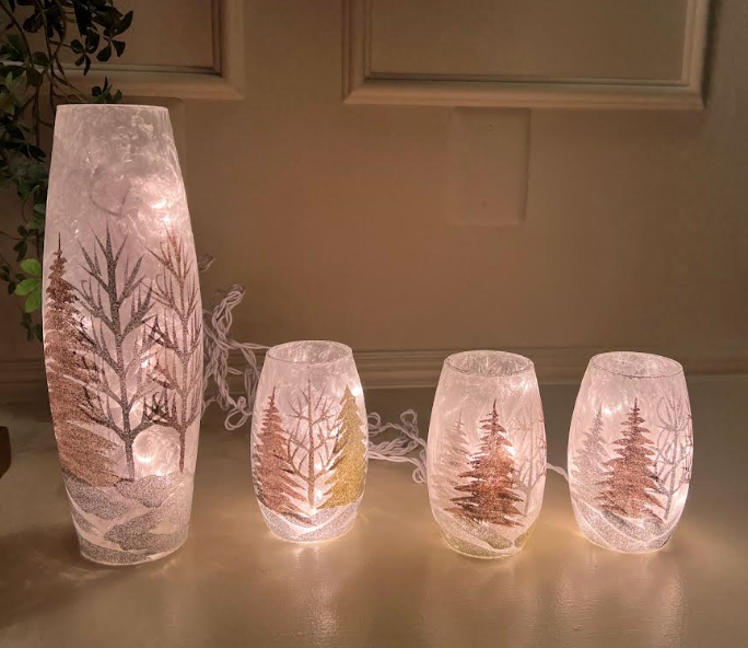 Transform your space into a sparkling Winter Wonderland with this enchanting set of 4 lighted vases. Each vase glows softly from within, illuminating beautiful wintry scenes ? perfect for creating a cozy, festive atmosphere all season long.