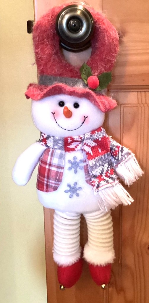 This Snowman Door Hanger will add a cheerful touch of color to your door. Measures 16 inches long with springy legs and bells on his shoes
