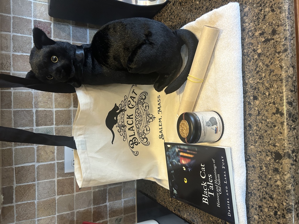The winning bidder will receive multiple items from the Black Cat Curiosity Shoppe of Salem, MA. The package includes a Black Cat bag, a book for history and hauntings of Salem, a walking tour for 2, and a fabulous Black Cat stuffy.