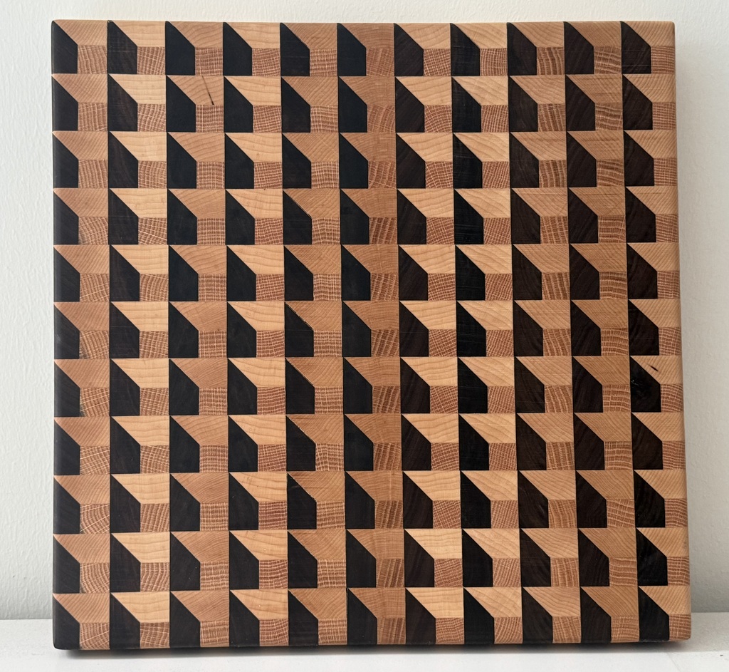 This cutting board was handmade by the father of one of our listeners who served two years in the Iraq War. It is made from Maple, Oak, and Black Walnut and measures 16 X 16
