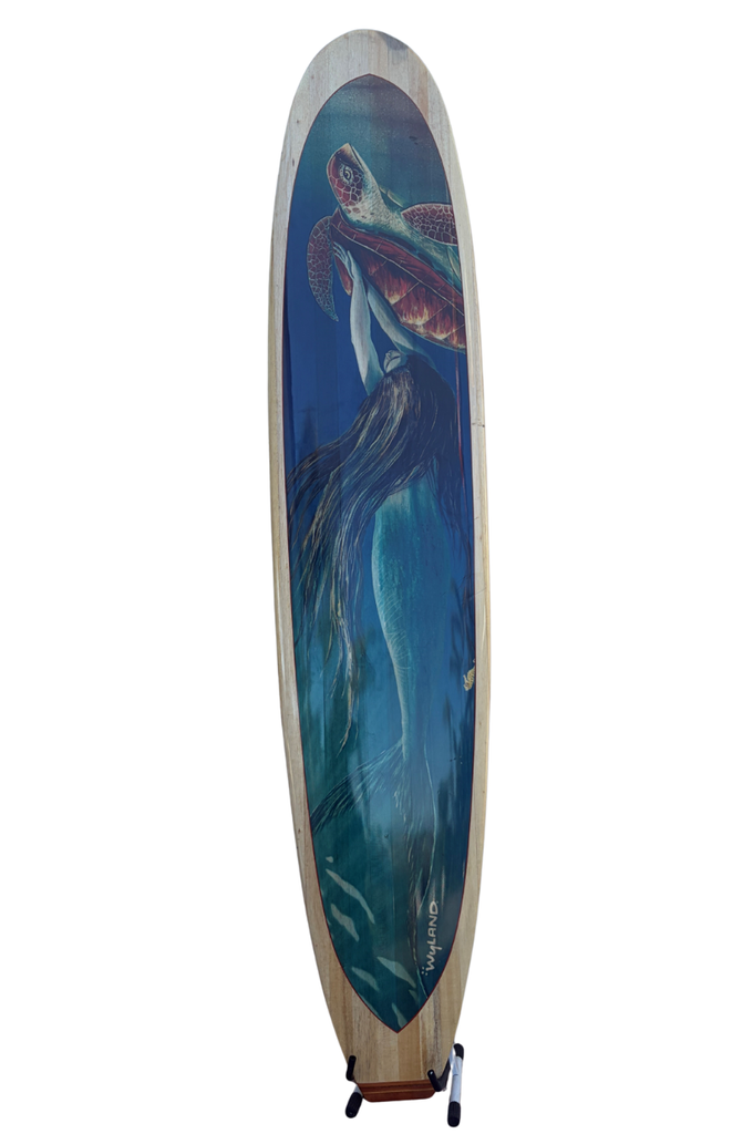 This 2001 original wyland print #33/100 on an 8' balsa wood surfboard depicts a mermaid traveling with a majestic sea turtle.