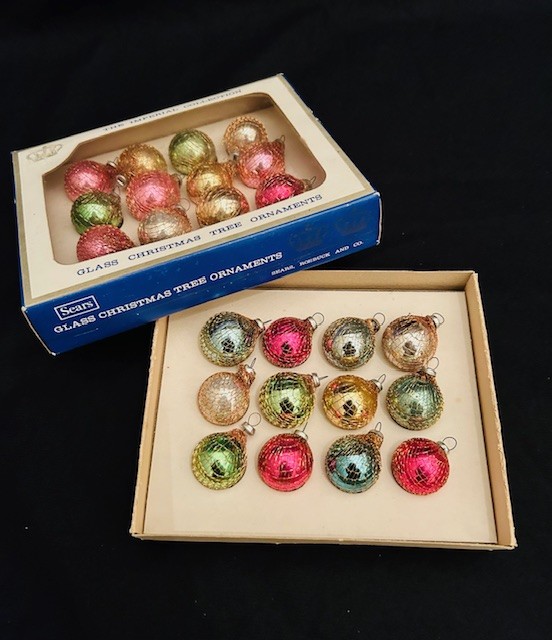65 years old, wow!  So pretty: adds year-round ORIGINAL VINTAGE CHARM to any decorations.  These beautiful blown-glass ornaments were handmade in Japan during the 1960's and feature classic 1950's / 1960's colors with delicate gold netting around each ornament.  They are in pristine mint condition (as are the 2 blue-and-white boxes, which are labeled "Sears Imperial Collection" #93113, Japan).  Colors are pink, aqua, light green, and gold.  (Note: Check eBay: they are selling these same ornaments for $130 per Box. wow!)