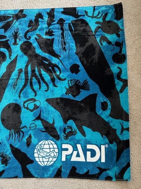 You won't find this online: custom Limited Edition!!! Eco-inspired PADI "Ocean Sea Life" Towel. (Thick and oversized, in turquoise, cerulean, and black colors.) This was a 1-time "50th Anniversary Co-branding" between PADI Scuba and "Leus", to create a custom sea-inspired design celebrating Oceans and Sustaiability. Towel is beautifully made and EXTRA-THICK: it's created from 100% cotton (so is machine-washable) - with a plush velour front, durable printing, extra absorbancy, and white terry-loop on the back. Rare PADI Prom Item, very hard to find. Size is 58.5" by 33". Item can be shipped nationwide to Winning Bidder after the Auction - or picked up for free in Enfield, CT. (This will become your MOST-FAVORITE Towel, ever!)