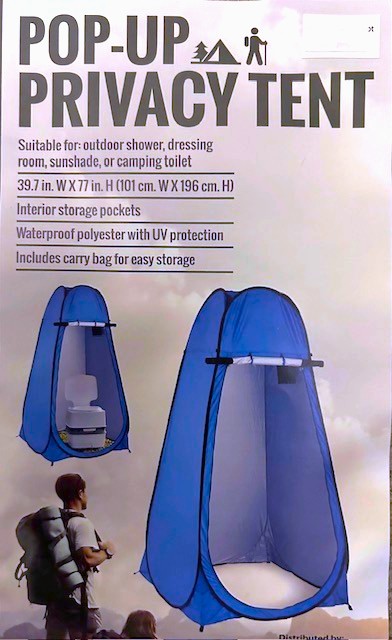Amazing Invention: We love this product for Travel (and changing out of wet bathing suits or wetsuits at the Beach or at Dive Sites). Useful as a Changing Room, Sunshade, Outoor Shower, or Camping Toilet. Lightweight and easily "pops up" to open (and is full-size, you can fully stand up in it to change). (Similar to the design of folding Car Windshields, which fold flat.) Most popular BLUE Color with a zippered entry for privacy. (See photos.) Also includes a Carry Bag for easy storage. Made of waterproof polyester for UV Protection. Size when open is 77" High by 39" Wide. Available for shipping to the Winner nationwide - or pick-up for FREE in Enfield, Connecticut after the Auction. Best "Creative Product" of the Year (and a perfect Holiday Gift)!