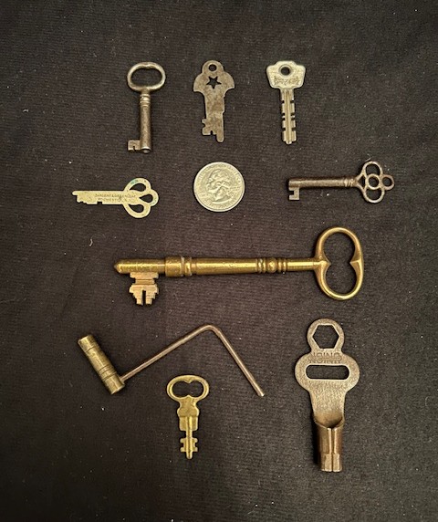 These are the REAL THING; they are not reproductions. We adore these ANTIQUE and VINTAGE OLD KEYS for decorating. Made from Brass and Metal, this item includes "9 Keys" (as shown in the attached photo). Highlights include Antique "Clock Winding Keys", "Bank Vault Keys", "Skeleton Keys", "Sargent and Greenleaf Key" and even a vintage "Roller Skate Key" (everyone's favorite from childhood). This "9-Key Collection" can be shipped nationwide to the Winning Bidder (with insurance) or picked up for FREE in Enfield, CT after the Auction. Makes a unique Gift - and actual VINTAGE TREASURE! (Be sure to check out our other "Antique Keys" in this Auction, too.)