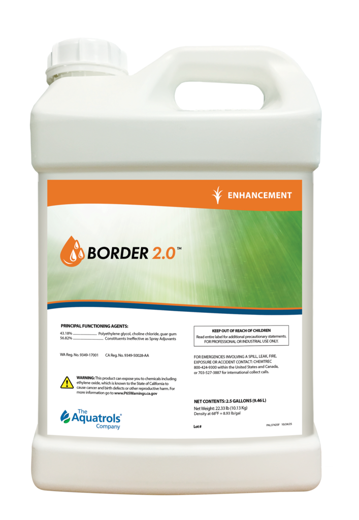 Border 2.0 is a concentrated liquid adjuvant for spray droplet management. It enhances the performance of spray applications by modifying the physical characteristics of the spray droplet, improving droplet retention while reducing off-target movement.