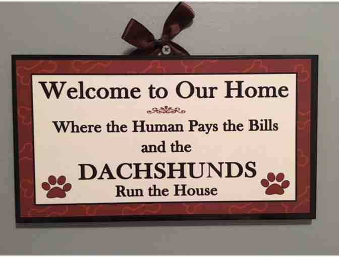 If your dachshund rules the roost, this sign is for you! Welcome visitors into your home with this whimsical dog plaque. Measuring 5.5" by 10", this durable sign consists of an acrylic board and digital print. A satin brown ribbon hanger allows for easy display. Intended for indoor display only.