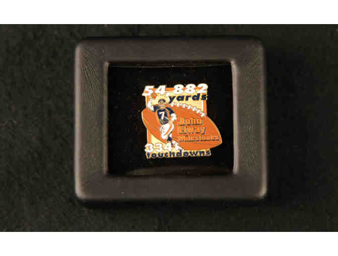 John Elway "Milestones" collector pin is limited to 1,000 made and celebrates his rushing yards and touchdowns he accomplished in his career.
