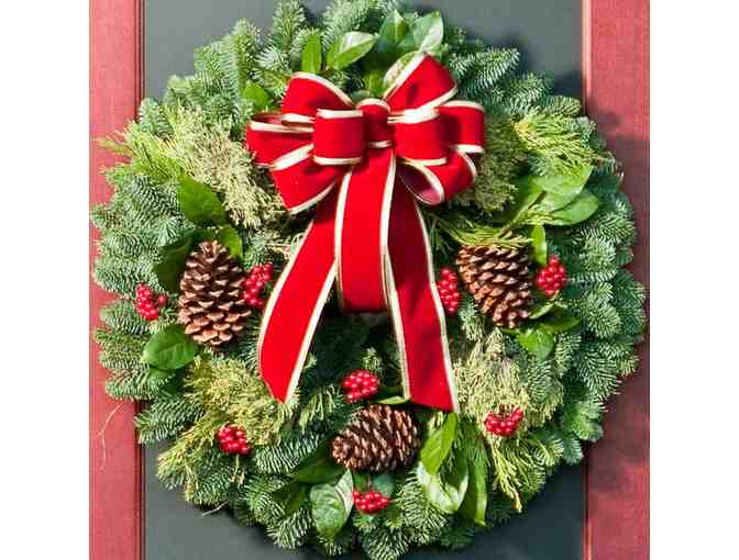 The trendy Red Deluxe holiday wreath combines fragrant noble fir with the luster of the salal leaf. The noble fir and salal are accented with juniper and incense cedar. This holiday wreath also sports a festive wired red velveteen bow and clusters of red berries; along with 3 ponderosa pine cones.