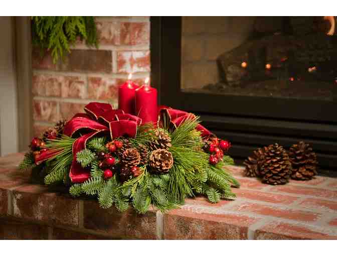 The 20" Home for the Holidays centerpiece combines fragrant noble fir and white pine with faux rose hips in shades of wine and red, red bows and candles, and ponderosa pine cones for a big, beautiful banquet-sized arrangement. This one's truly nice to come home to.